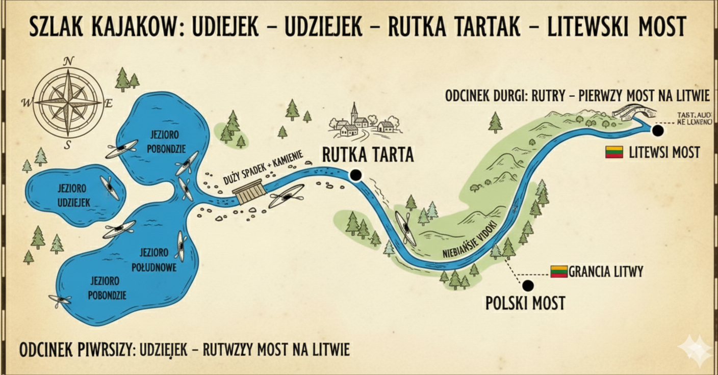 Spływ zaczynamy w miejscowości Udziejek. Przepływamy przez okoliczne jeziora. Wypływając z jeziora Pobondzie zaczynamy najtrudniejszy odcinek szlaku. Znajduje się tu duży spadek, kamienie oraz niskie kładki. - Odcinek drugi: Rutka Tartak – Pierwszy most na Litwie