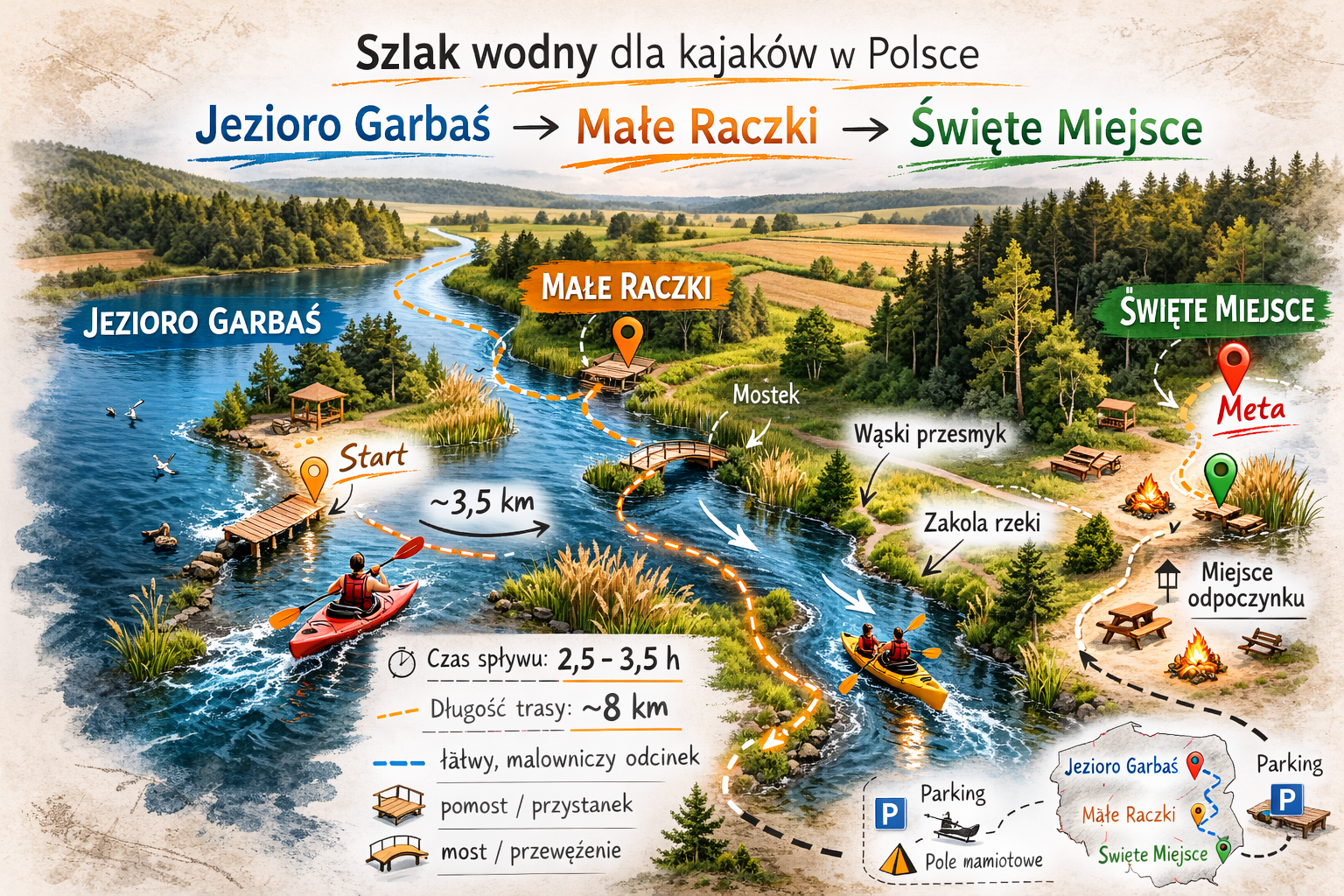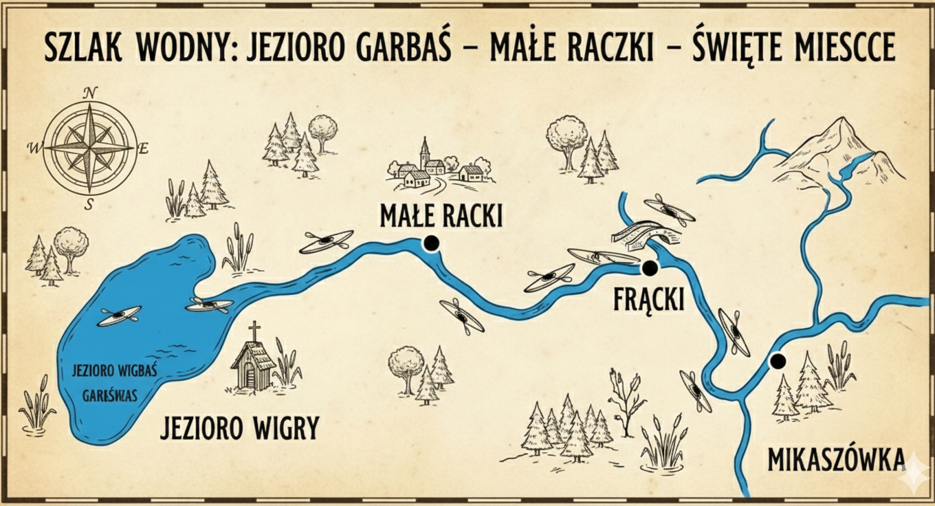 Pierwszy etap spływu zaczynamy na jeziorze Garbaś. Jest to niezwykle atrakcyjny odcinek szlaku. Zauważamy nisko zawieszone mostki, powalone drzewa i kamieniste płycizny. Początkowo nurt jest bardzo silny, a rzeka głęboka. Dalej płyniemy spokojnym strumieniem, który meandruje przez zabagnione obszary. W końcu dopływamy do Małych Raczek. - Odcinek drugi: Małe Raczki – Święte Miejsce